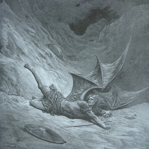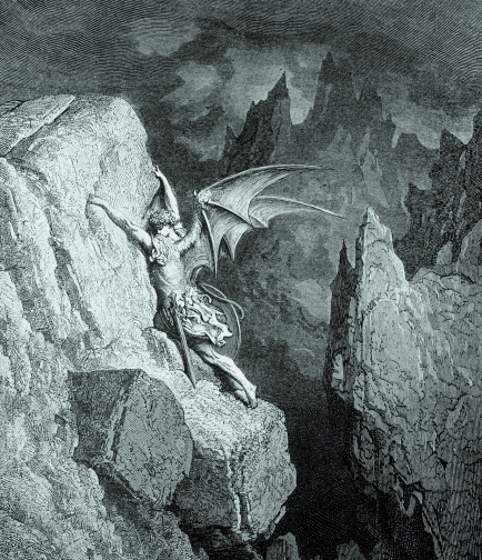 但丁的《神曲》,约翰·弥尔顿的《失乐园》,都是说撒旦因为拒绝臣服于圣子基督,率天众三分之一的天使于天界北境举起反旗。经过三天的天界激战,撒旦的叛军被基督击溃,在浑沌中坠落了九个晨昏才落到地狱。此后,神创造了新天地和人类,撒旦为了复仇兼夺取新天地,乃化为蛇潜入伊甸园,引诱夏娃食用了禁断的知识之树的果实,再利用她引诱亚当也犯下了违抗神令的罪。于是撒旦如愿使神的新造物一同堕落,而且为诸魔神开启了通往新世界的大门,自此罪、病、死终于遍布地面。
