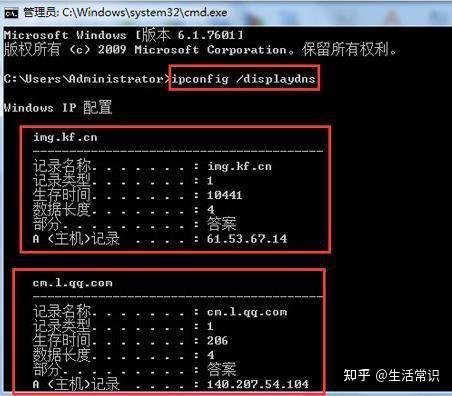 步骤2,在新弹出的命令提示符窗口中输入“ipconfig/displayDNS”,可以看到当前系统使用的DNS地址,如下图所示: