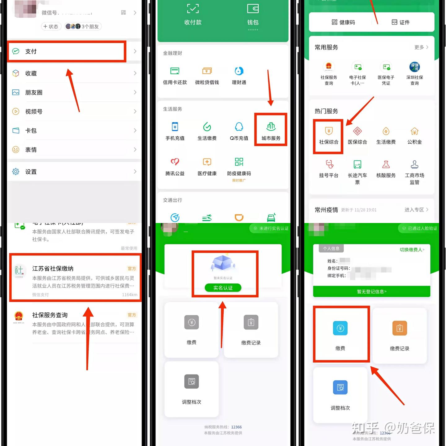 微信支付页面进入“城市服务”,选择自己所在的城市,点击“社保综合”,选择“自己所在省社保缴纳”,通过实名认证后,点击“缴费”即可。