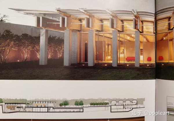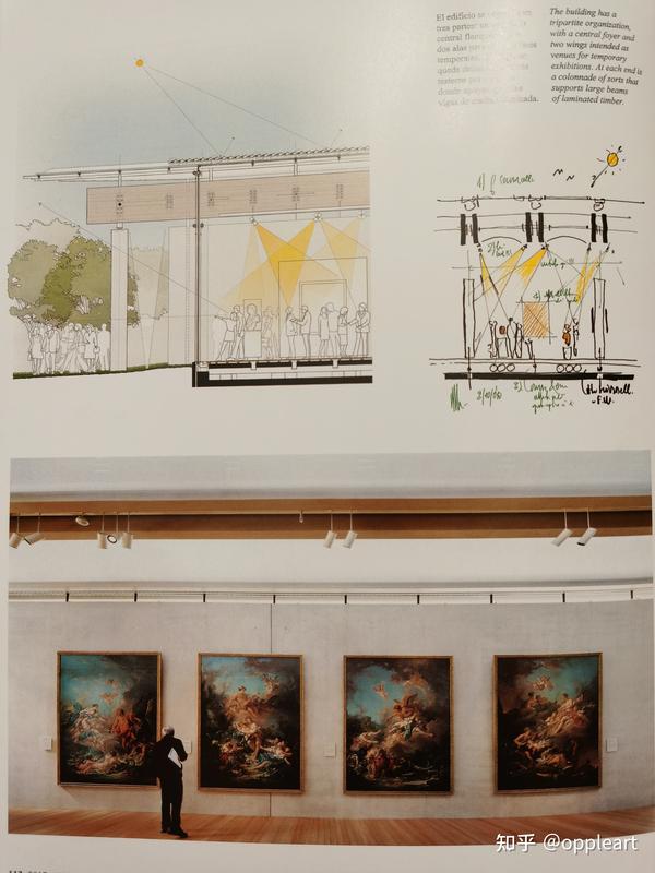 对于Kimbell Art Museum Extension金贝尔美术馆的扩建,从下面这个草图就可以看出,建筑的设计原则是顺承康对于设计的两大亮点:拱形重复性单元、光线的运用。