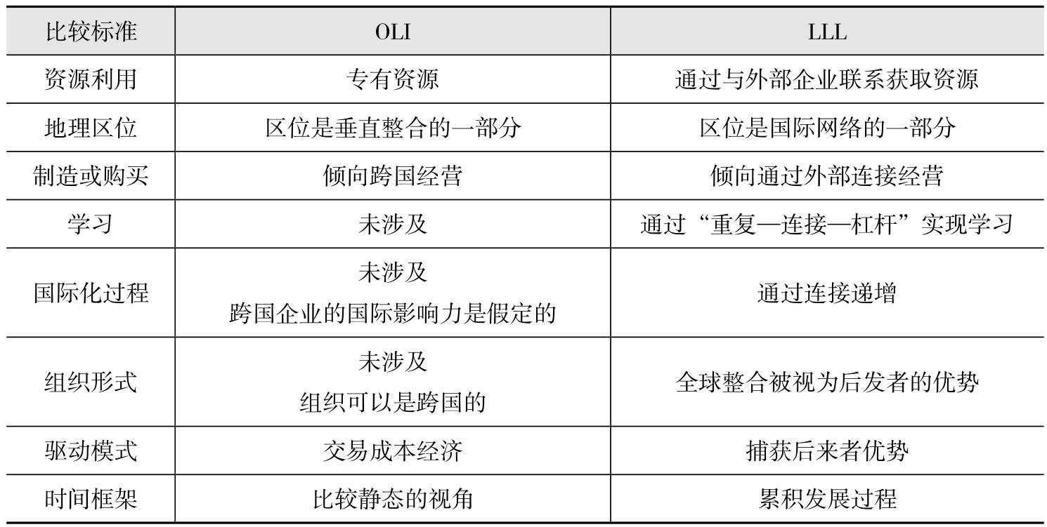 在 OLI 理论的基础上,Mathews(2006)针对中国跨国企业国际市场拓展的现实特点提出了「连接—杠杆—学习」的框架主张(即 LLL 理论),对 OLI 理论进行了扩展。具体而言:第一,连接,强调利用全球经济互联的特点,与技术丰富的企业或在目标市场上已经活跃的企业建立联系并加以利用;第二,杠杆,重点将放在资源本身及其杠杆潜力上,关注资源的可获得性、可模仿性、可转移性和可替代性;第三,学习,强调通过反复参与连接和杠杆作用的过程,学会吸收和部署复杂的资源,从而使中国跨国企业能够克服外来者劣势(Mathews2002,2006;Li2007)。LLL 理论框架展示了企业,尤其是来自东亚的新兴市场跨国企业如何通过与发达市场跨国企业和关联方建立联系,并利用其自身资源与新资源组合来获得所需的关键资源。LLL 理论认为中国跨国企业之所以进行国际化,更多的是受到海外市场战略资源的吸引,这些企业倾向于采用与海外跨国企业结成战略联盟等方式来建立连接关系,继而利用杠杆和学习策略,将在海外市场所获取的资源整合为企业的自身优势,以克服企业资源相对匮乏所带来的掣肘,实现企业在国际市场的快速成长(Ge and Ding2008;Mathews2017;Ray et al.,2017)。