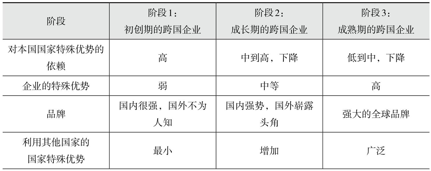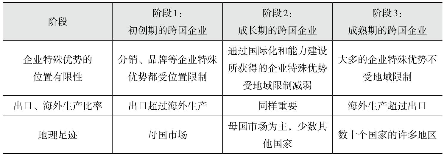 表 2.2 跨国企业不同发展阶段国家特殊优势和企业特殊优势的变化