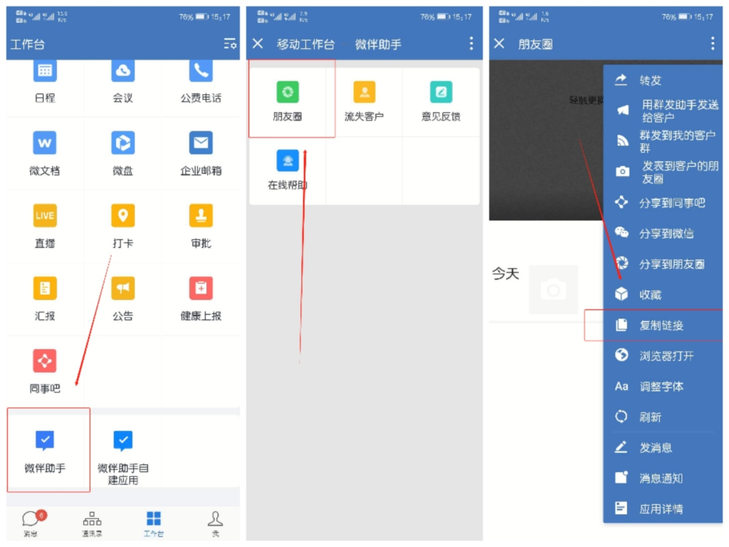 这时我们需要微伴助手的帮助,当企业在企业微信管理后台中配置微伴助手后,员工就可以在企业微信的工作台中进入微伴助手的朋友圈功能,在这里就可以获得朋友圈链接啦。