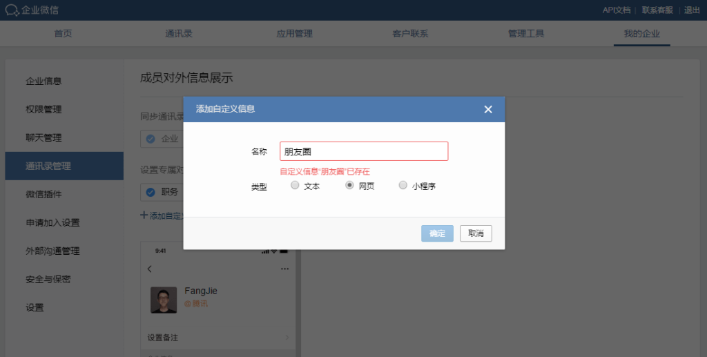 这时需要管理员进入企业微信管理后台,在【我的企业】-【通讯录管理】-【对外资料显示】-【修改】中添加朋友圈入口。