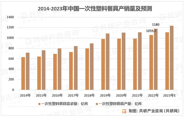 随着餐饮行业的复苏,地摊经济的崛起,我国市场对一次性塑料餐具的需求快速上升,产量不断扩大。2022年国内一次性塑料餐具产量1059.2亿件,需求量1180亿件。