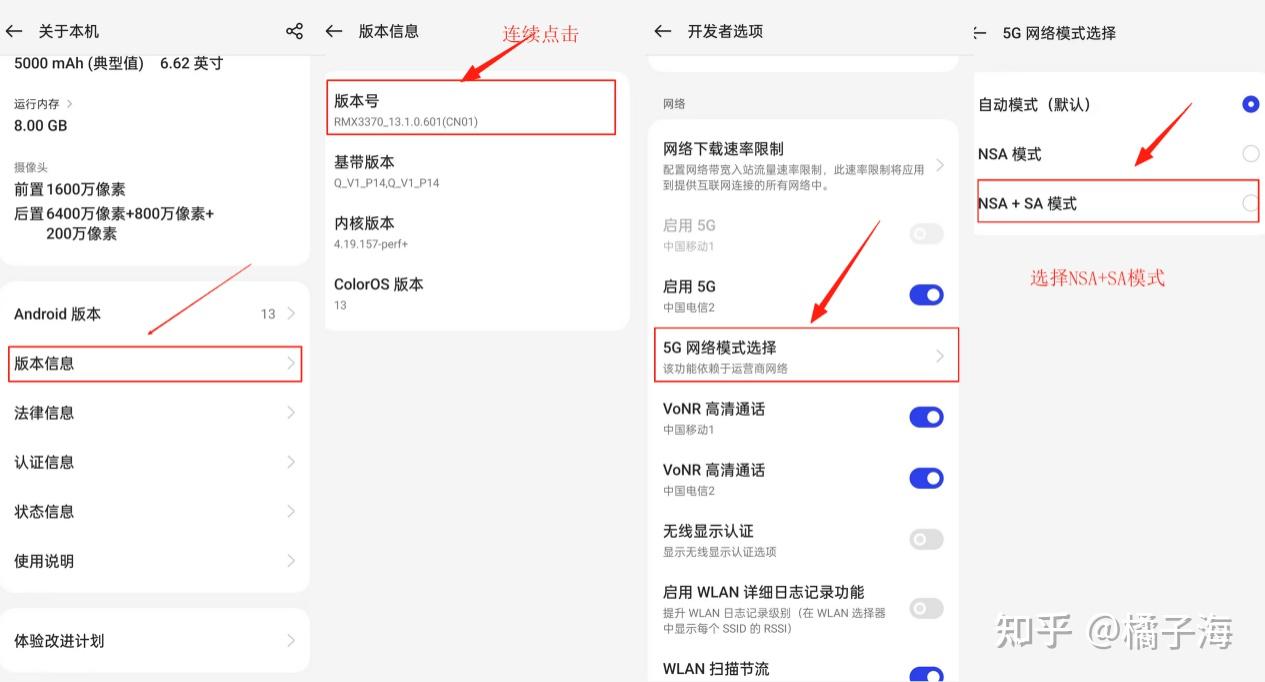 如果通过上述方法仍然连接不到5G-SA网络,可能是手机未打开该功能。可以在设置里进入开发者模式,以安卓手机为例:打开手机设置—进入关于手机—找到版本号—连续点击5次以上进入开发者模式—进入其他设置—点击开发者选项—5G网络模式选择。