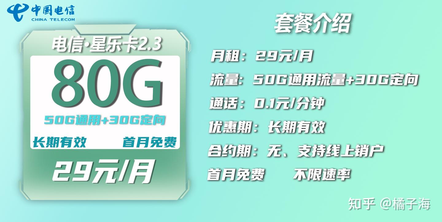 叠加套餐:首月赠送40话费用来抵扣首月月租(仅当月有效)综上:电信星乐卡2.3实现首月免费,往后长期有效的29月租包50G通用流量+30G定向。