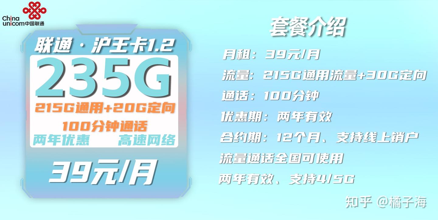 叠加套餐:0元叠加200G全国通用流量(两年有效)综上:联通沪王套餐长期有效,每月39包215G全国通用流量+20G定向流量+100分钟通话。