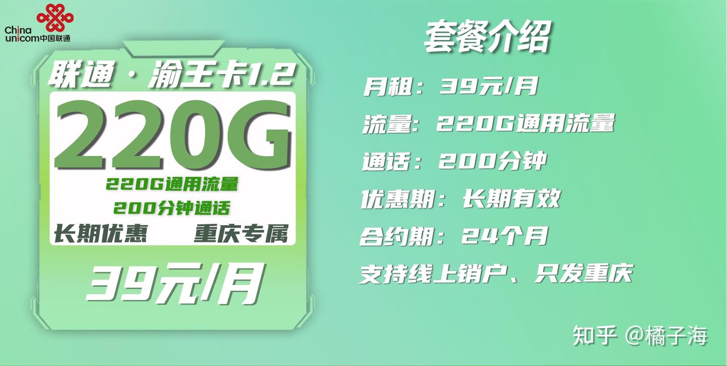 套餐外资费标准:通话0.15元/分钟,5元/G,0.1元/分钟综上:联通渝王卡首月全价全量,往后39月租包220G通用流量+200分钟通话,长期有效。