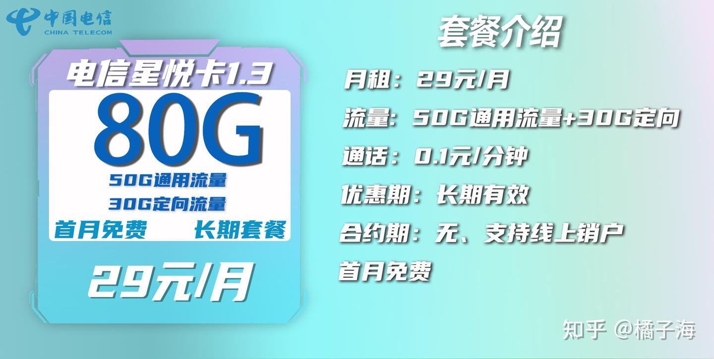 叠加套餐:首月赠送30话费用来抵扣首月月租(仅当月有效)综上:电信星悦卡实现首月免费,往后长期29月租包50G通用流量+30G定向流量+0.1元/分钟。