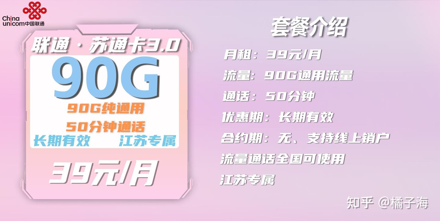 叠加套餐:0元叠加50分钟通话时长(长期有效)综上:联通苏通套餐首月按天折算,往后长期39月租包90G全国通用流量+50分钟通话。