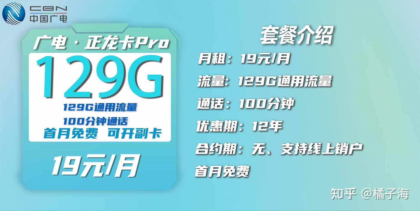 叠加套餐:首月激活自动赠送29话费用于抵扣首月月租,即首月免费综上:广电正龙Pro套餐首月免费,第2-6个月每月19月租包129G通用流量+100分钟通话,往后十二年每月29月租包129G通用流量+100分钟通话。