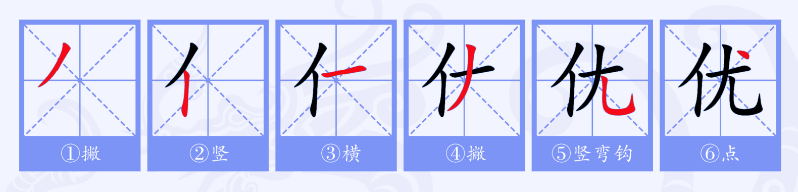 “优”繁体写作“優”,是形声字。字形以“人”为形旁,表示该字的本义与人有关;“憂(忧的繁体)”作声旁,表示读音与此接近。汉字简化时将声旁替换为“尤”。
