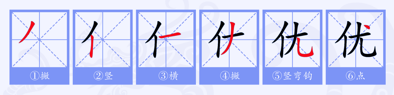 上等的,非常好的(跟“劣”相对) | good;fine; excellent | 优良;优美;优等;优秀;优异;优劣 | |||
