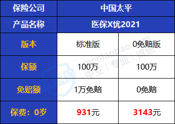 假如给刚出生的孩子买,0免赔要比1万免赔贵出3143-931=2212元/年!