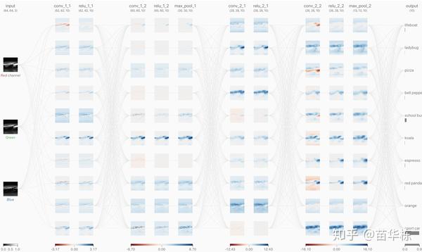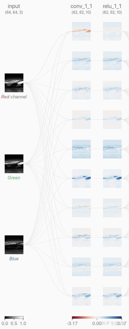 这里的卷积层输入分别来自RGB三通道,其中RGB的范围是[0,1],中间过程的输出我们用蓝色表示正值,红色表示负值,白色表示零。如果图片越红,表示值越小;越蓝,表示值越大。