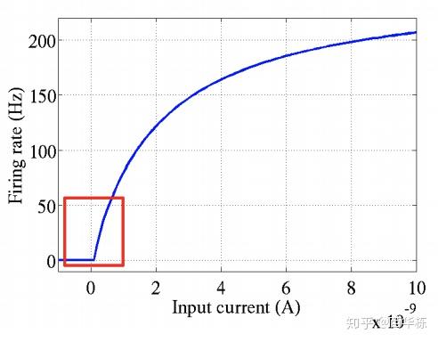 我们再看生物神经元激活的曲线,如下图。横轴是激活电流,纵轴是发射频率。发射频率我们可以简单理解为单位时间内的平均电峰数量,也就是细胞核对输入的触发响应。例如受神经驱动的肌肉的收缩力量,就单纯取决于动作神经元的“发射频率”,也就是单位时间内的平均电峰数量。