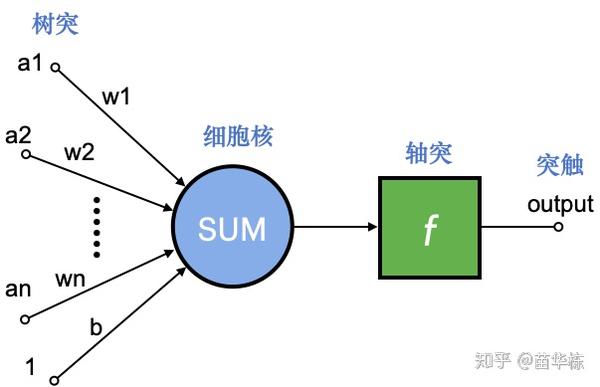上图是人工神经网络中的一个神经元,其中我标出了对应生物神经网络相应的部位,相应的数学函数就是