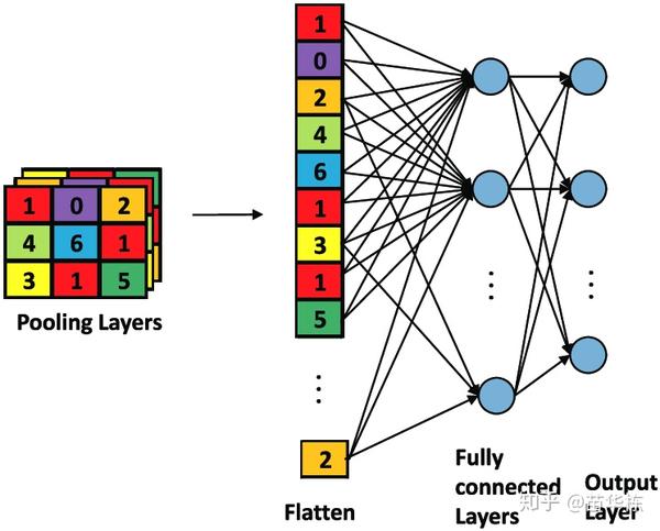 5. 到此,我们的卷积神经网络的核心功能已经完成。但是输出还是二维的图像数据,我们需要将二维数据展平为一维数据,这个过程我们叫做Flatten,如下图所示。