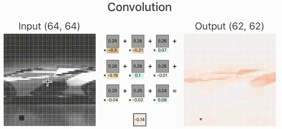 下面的动图用来表示其中的一个卷积核计算的过程,分别对3个通道做卷积核,然后进行线性叠加。