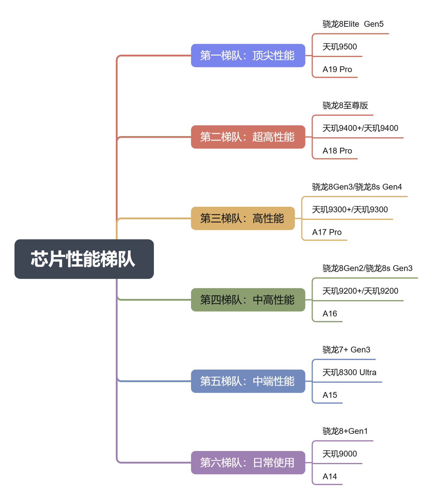 性能铁三角中,最关键的还是看芯片性能。这里我将市面上比较常见的芯片整理出来形成五大梯队,购机时尽量不要选择性能比第六梯队还低的芯片。条件允许尽量选择第一到第三梯队之间的芯片,日常使用流畅,还能比普通芯片的多用一两年。