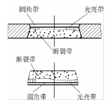 (1)圆角带。圆角带是冲裁过程中刃口压入材料时,刃口附近的材料被牵连拉入模具而变形的结果。这是由塑性弯曲、拉深造成的,塑性好的材料其圆角带较宽。