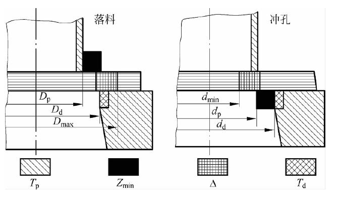 加载中...;Dp为落料凸模刃口的基本尺寸;dd为冲孔凹模刃口的基本尺寸;dp为冲孔凸模刃口的基本尺寸;Dmax为落料件的最大极限尺寸;dmin为冲孔孔径的最小极限尺寸;Δ 为冲裁件公差;Zmin为最小双面合理间隙;Zmax为最大双面合理间隙(图中没有标出);Td为凹模刃口制造公差;Tp为凸模刃口制造公差;K 为系数。