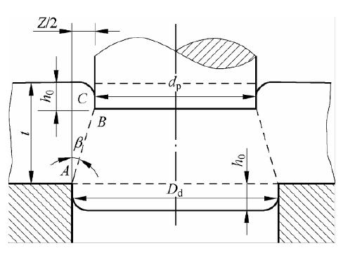 式中,Z 为双面间隙值;t 为板料厚度;h0为产生裂纹时凸模压入材料的深度;h0/t 为产生裂纹时凸模压入材料的相对深度;β 为剪裂纹与垂线间的夹角。