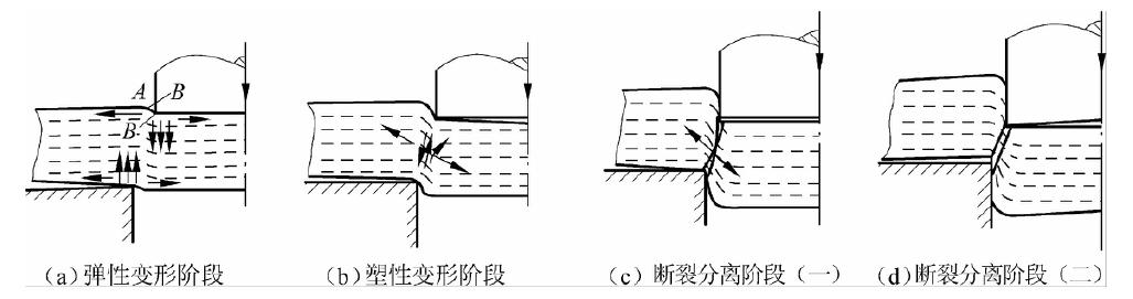 如图 2-1(a)所示,当凸模接触板料并下压时,在凸、凹模压力作用下,板料开始产生弹性压缩、弯曲和拉伸等复杂变形。这时,凸模稍微挤入板料,板料底面相应部分材料也稍微挤入凹模洞口内。此时,凸模下面的板料略有拱弯(锅底形),凹模上的板料略有上翘。间隙越大,拱弯和上翘越严重。在这一阶段,若板料内部的应力没有超过弹性极限,当凸模卸载后,板料立即恢复原状。随着凸模的下压,刃口附近板料所受的应力逐渐增大,直至达到弹性极限,弹性变形阶段结束。