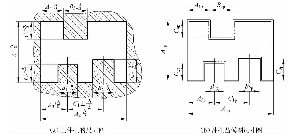 式中,Ap、Bp、Cp分别为凸模刃口尺寸;A、B、C 分别为工件孔的基本尺寸。