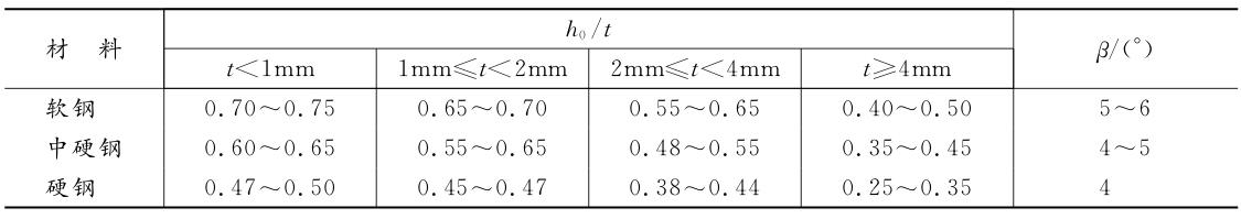 从上式可以看出,合理间隙值 Z 与材料厚度 t、相对压入深度 h0/t、剪裂纹方向(角度)β 等有关。而 h0/t 和 β 又与材料的性质有关,因此影响间隙值的主要因素是材料的性质和材料厚度。不同材料的 h0/t 与 β 值如表 2-3 所示。