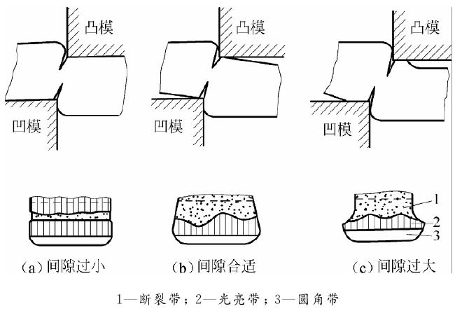 当间隙合适时,上、下裂纹延伸后能汇合成一条线,如图 2-3(b)所示。尽管断面也有斜度,但零件比较平直,圆角、毛刺、斜度均不大,有较好的综合断面质量。