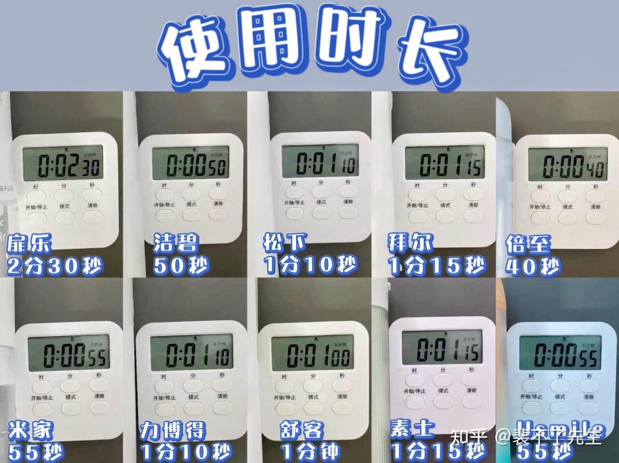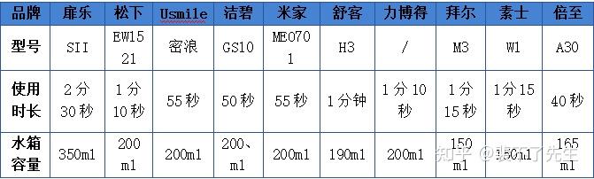 冲着冲着没水了,是用冲牙器时非常让人烦躁的事,还要停下来去加水,二次冲洗时可能忘了刚才冲到哪里。因此要格外关注它的单次使用时长,这和它的水箱容量,以及出水速率优化有很大关系。下图是各款式的使用时长对比: