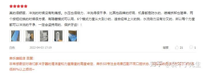 使用体验:清洁力特别出色,各个死角都能冲洗干净,而且特别舒适放松而不是那种强烈的刺激感,查资料发现是因为搭载了独家八大不伤牙黑科技,经国家级检测机构认证,强力清洁同时可有效降低75%冲洗伤害!另外它的兼容性也非常强,提供6个力度跨度极大的档位及5种特制喷嘴,口腔健康人群及敏感人群都能适用!