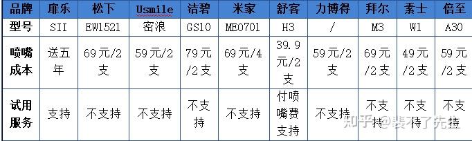 我和几十个品牌的售后都打过交道,一个专业、完善的服务体系非常重要。建议大家重点关注是否提供试用服务、质保时长和替换喷嘴的成本上。下表是参与本次测评各品牌的售后信息,具体大家看表格,我就不多说了: