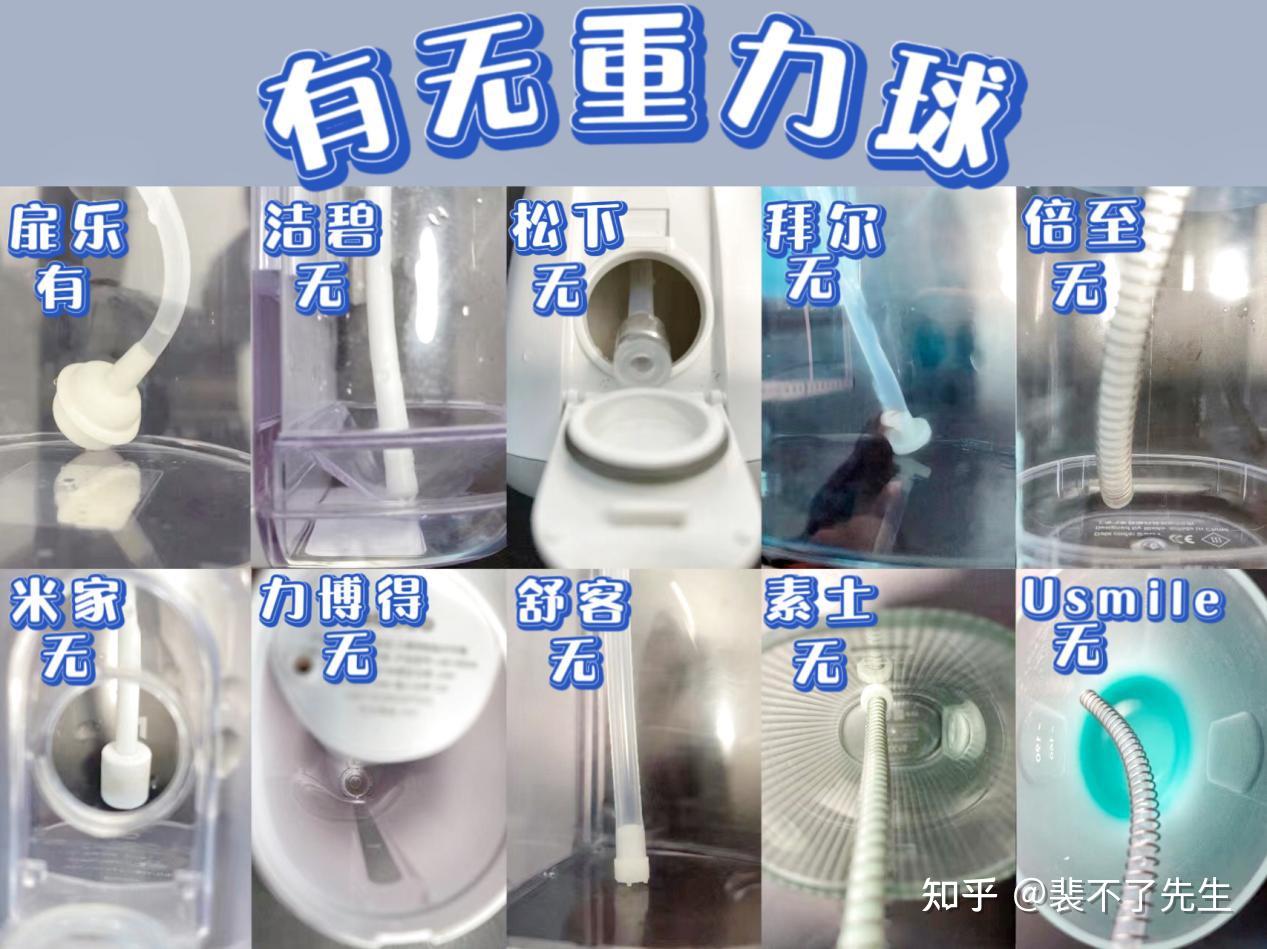 冲牙器的产品细节众多,其中是否搭载重力球也是重要的一点,仅有少数产品搭载,它位于吸水管末端,可以保证水箱水量少时,无论哪个角度都能吸到水。下面是本次参与测评各个款式的重力球情况统计: