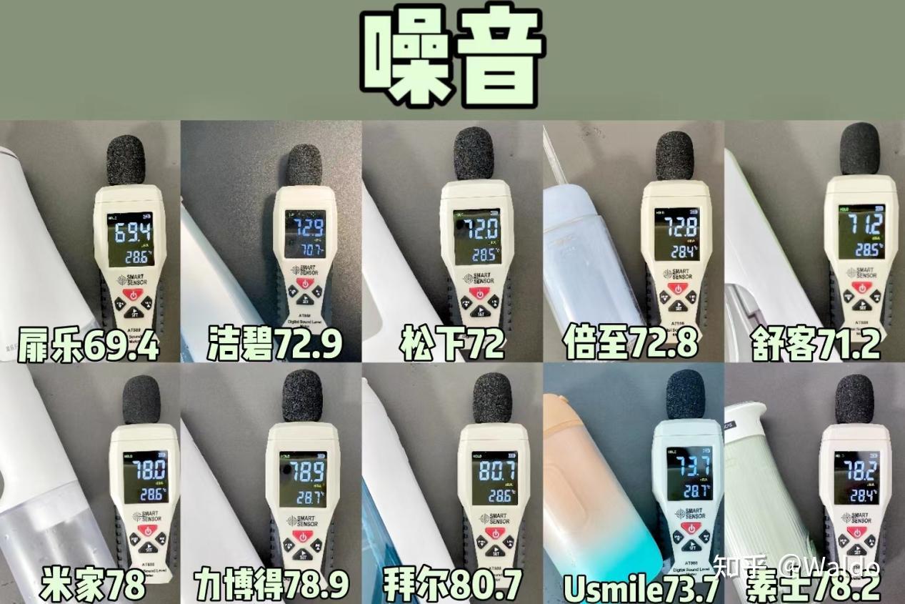有的冲牙器工作时噪音太大,也很闹心,一方面自己使用的感受不好,噪音太大,还会有损听你;另一方面太吵了,也会打扰到其他人。噪音大的冲牙器,往往其内部结构的精密度差,也能反映出产品的做工不够精细。下面是在安静环境下,用噪音检测仪检测的十款冲牙器噪音大小: