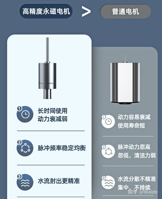 ②水泵电机:水泵和电机是冲牙器的核心配件,直接影响着脉冲频率的动力强度、衰减度和出水稳定性等。专业的品牌会选择优质高精度电机和金属水泵,噪音更小,使用寿命更长,出水力度稳定;而劣质的电机和水泵,转速频率过快,温度过高容易烧坏,使用寿命短,内部精密度不足,噪音大,使用时出水不均、水柱压力不稳定,有伤牙风险。
