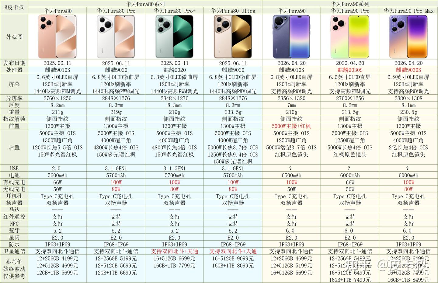 华为Pura系列参数对比如图: