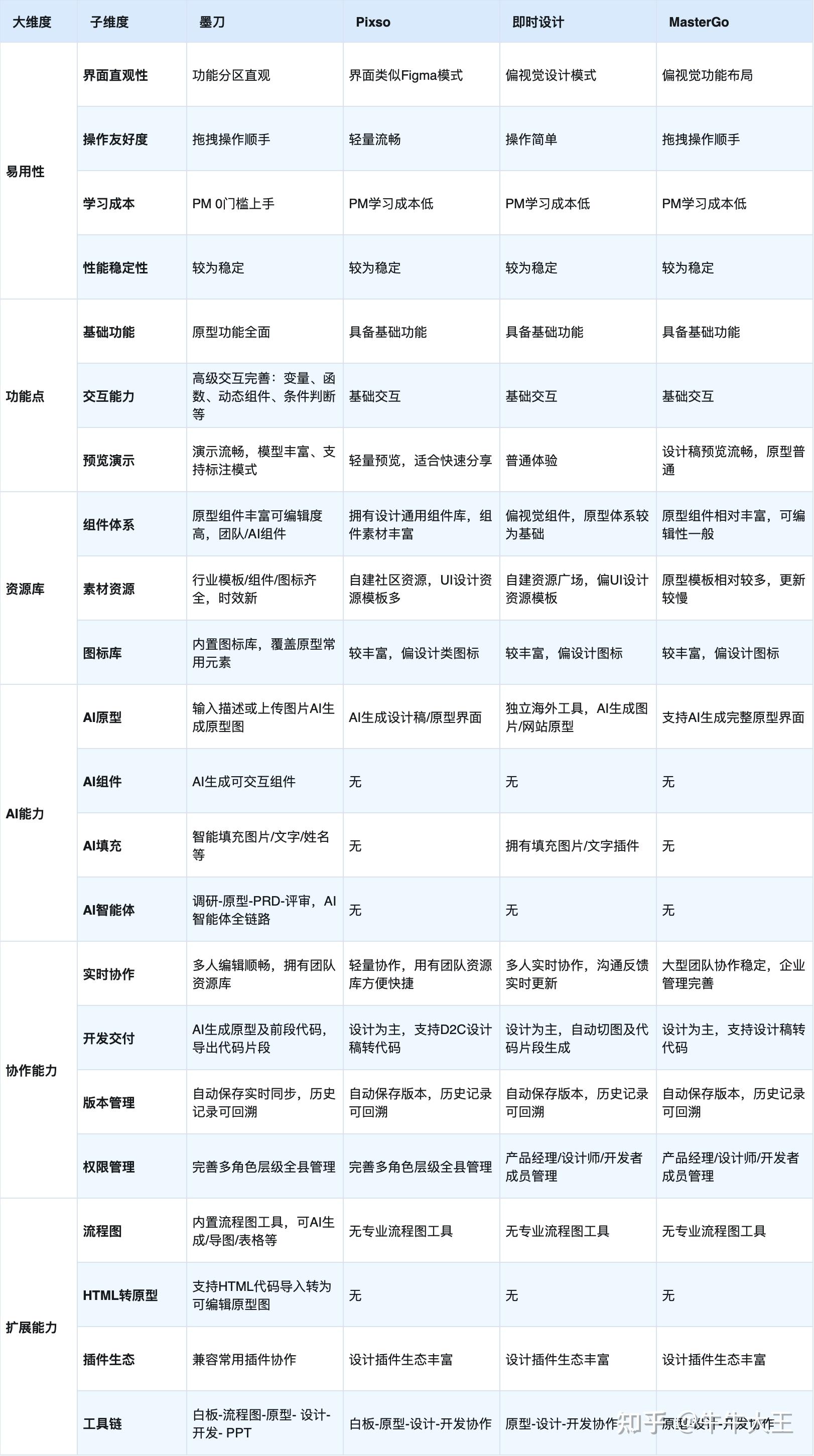 对四款工具的对比,需要基于产品经理的实际需求,虽然各个工具或平台有着产品设计相关的丰富能力,但在本篇文章中,我们只列出与“画原型图”高度相关的核心指标与分析维度: