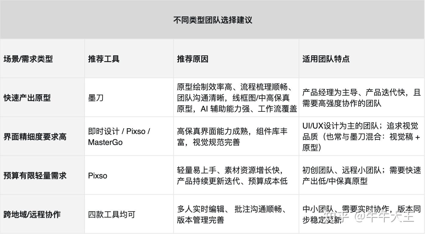 不同的团队在选择原型设计工具时,会根据团队角色、工作习惯和迭代节奏来判断哪款工具合适自己。因此,我也总结了几个不同团队类型的选择建议: