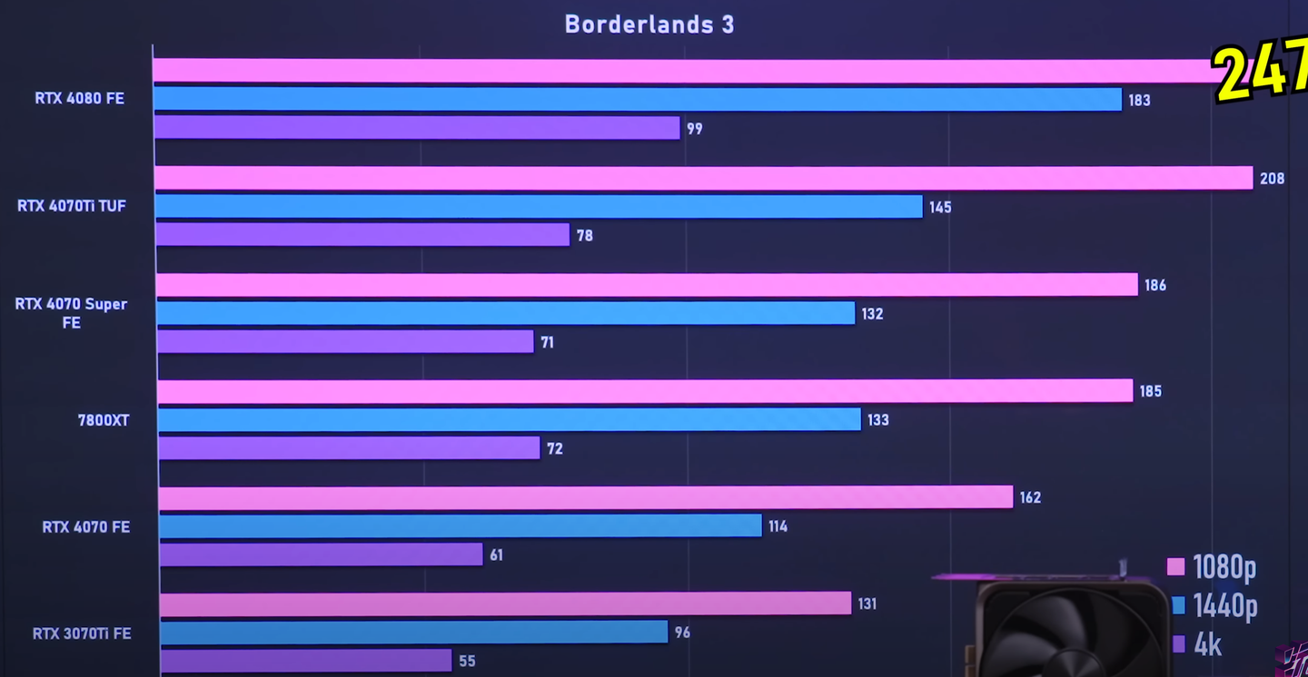 2、2k分辨率下,它的平均帧率比 4070 领先15%左右,但比4070 Ti落后6%左右。