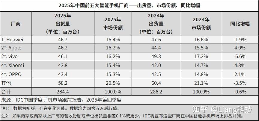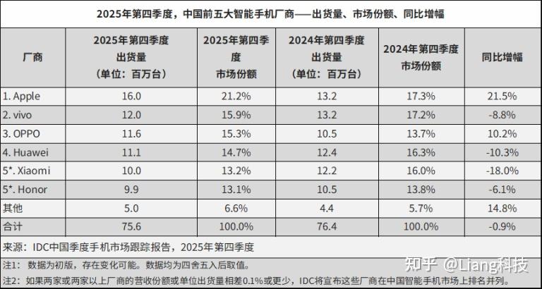 根据数据统计机构IDC公布的2025年第四季度全球智能手机销量报告来看,在中国范围内,苹果的销量依然占据榜首,但国产手机的销量也已经相当接近,不知道你身边用苹果手机的人还多吗?