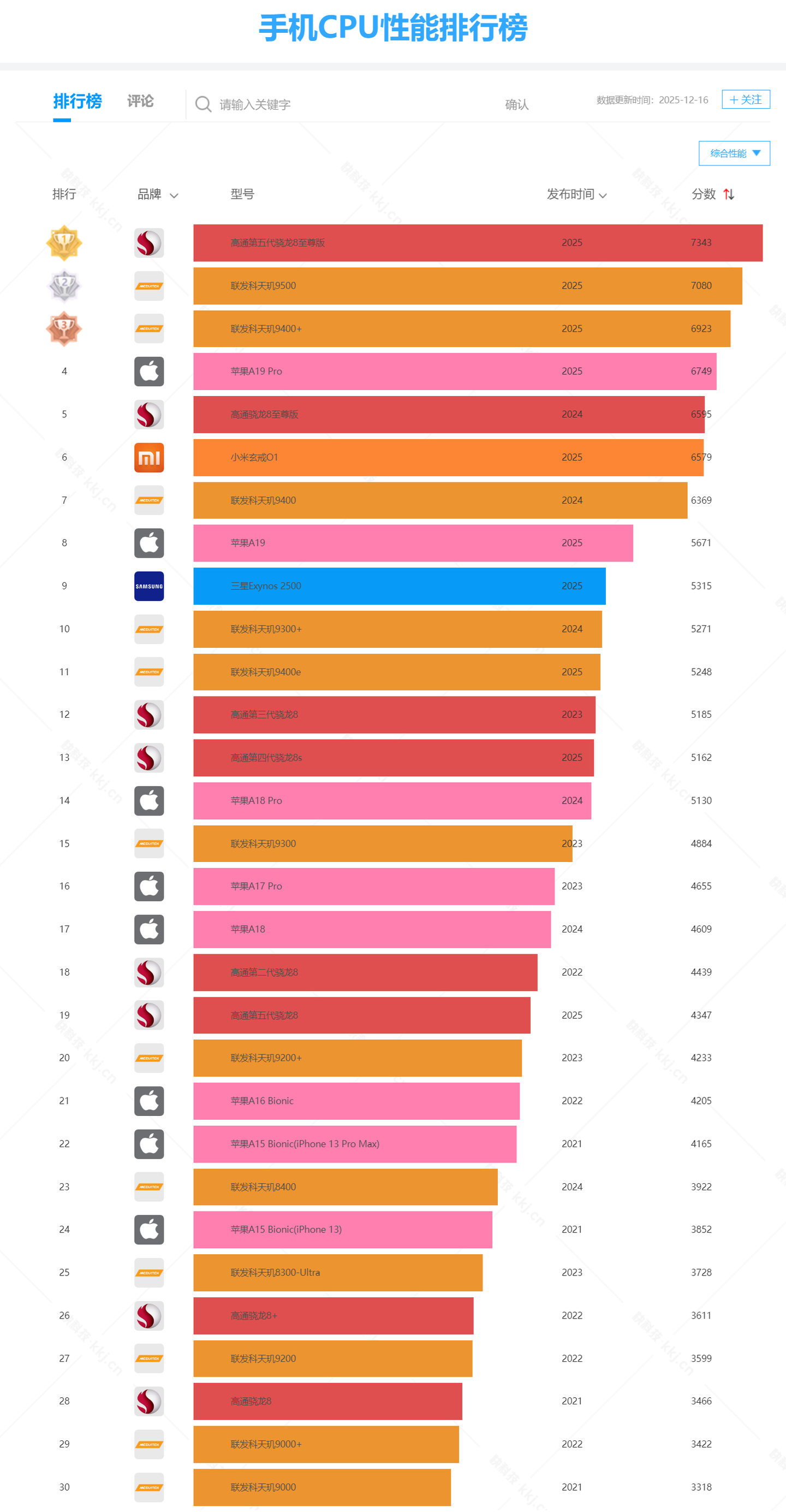 以我们选购手机时常见到的来说,当前安卓各品牌旗舰机第五代骁龙8 至尊版天玑9500为最强,其次到骁龙8 至尊版、天玑9400+、天玑9400;苹果移动处理器更新到A19Pro。