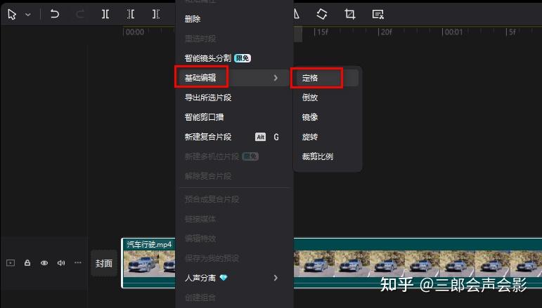 或者我们还可以在素材上右击,在弹出的快捷菜单中单击“基础编辑”里的“定格”命令,同样可以实现定格的效果;不过还是建议使用上一种方法,因为效率比较高一些!