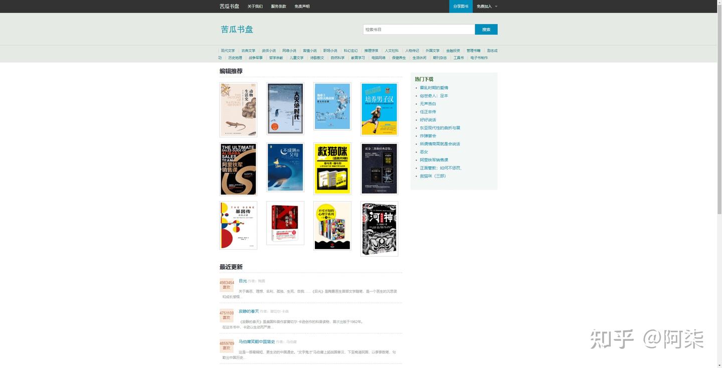 苦瓜书盘作为一个较为知名的书籍资源网站,其UI与豆瓣非常相似,是一个小清新的风格。网站提供了文学、社科、人物传记、历史地理等多个类别的电子书。