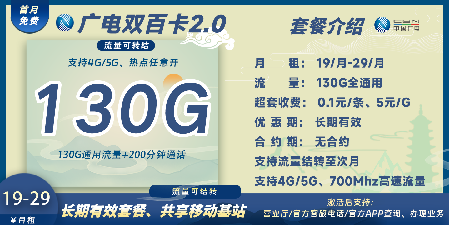 综上:广电双百卡2.0实现首月免费,往后19月租可享130G通用流量+200分钟通话,长期有效