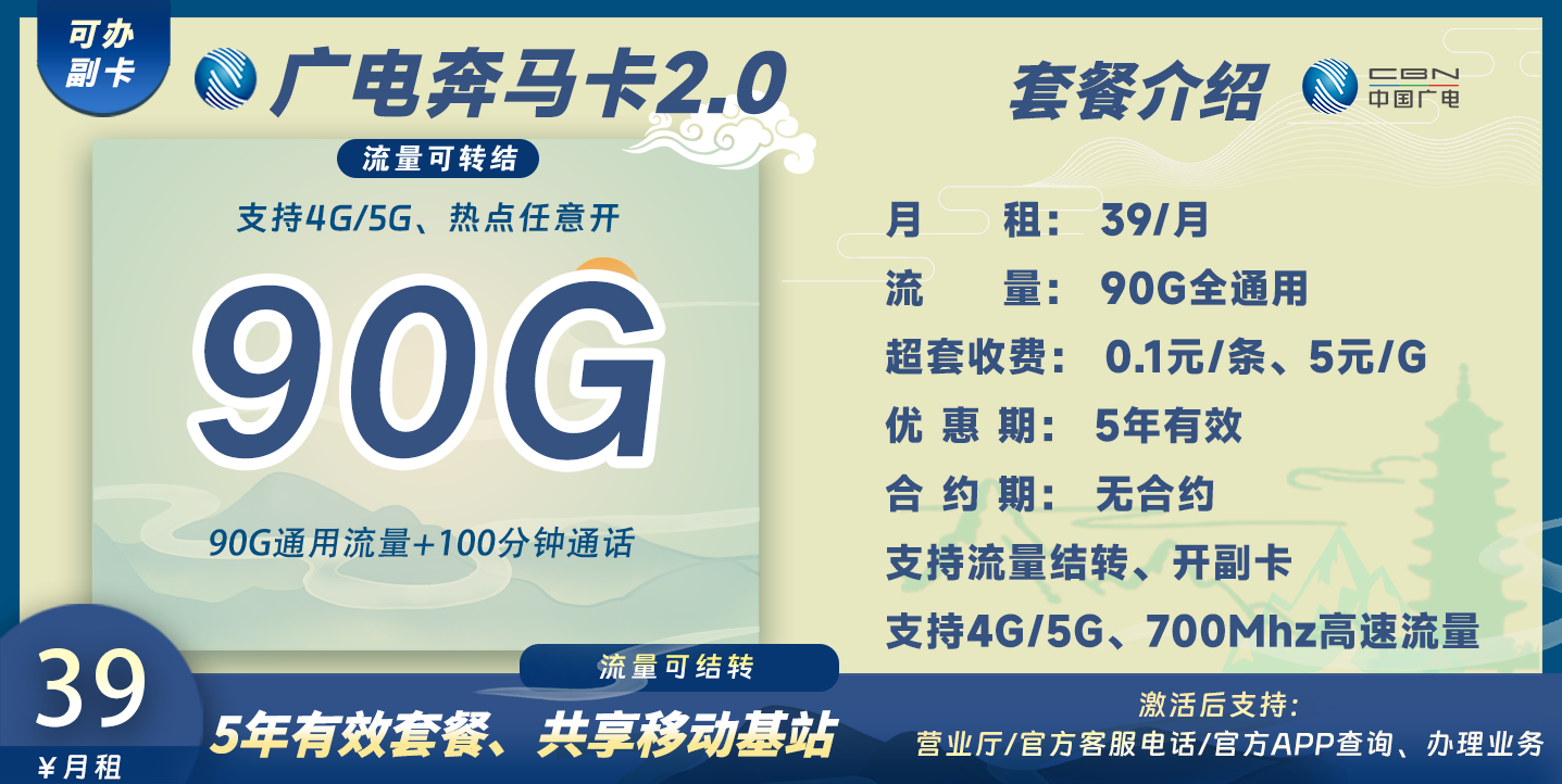 综上:广电奔马卡2.0实现首月免费,往后39月租可享90G通用流量+100分钟通话,5年有效