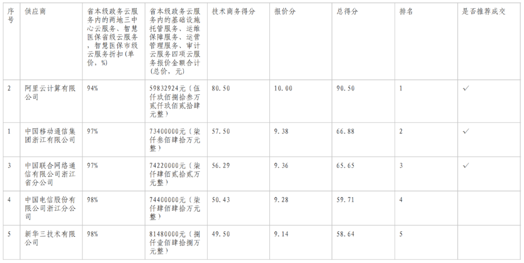 从中标候选人评分结果看,阿里云以80.50分的技术商务得分(远超第二名浙江移动的57.50分)和满分10分的报价分,最终以90.50分的总分稳居第一,同时获得推荐成交资格。