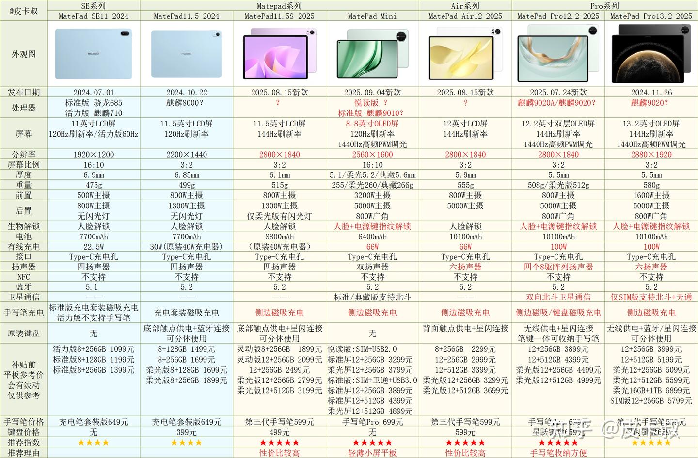 华为平板目前有四个系列:Pro>Air>数字>SE。其中SE系列主打入门,配置比较低,不太推荐。